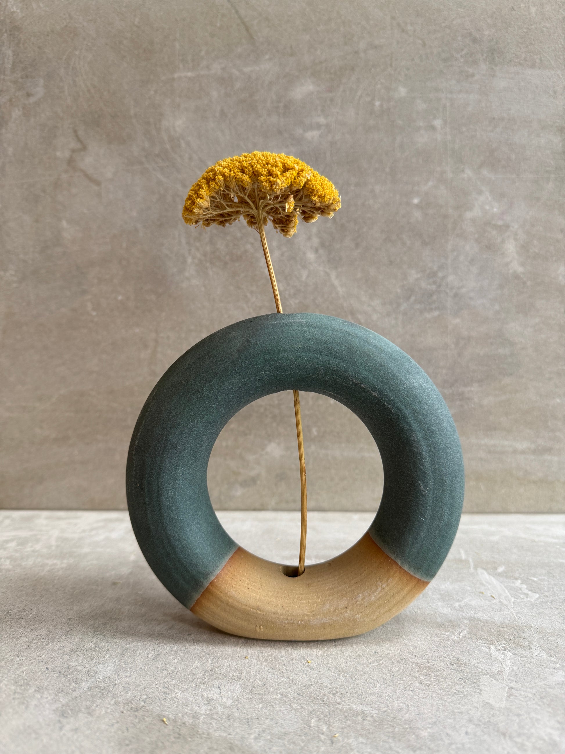 A simple ring vase in grey stoneware with a mat turquoise glaze.