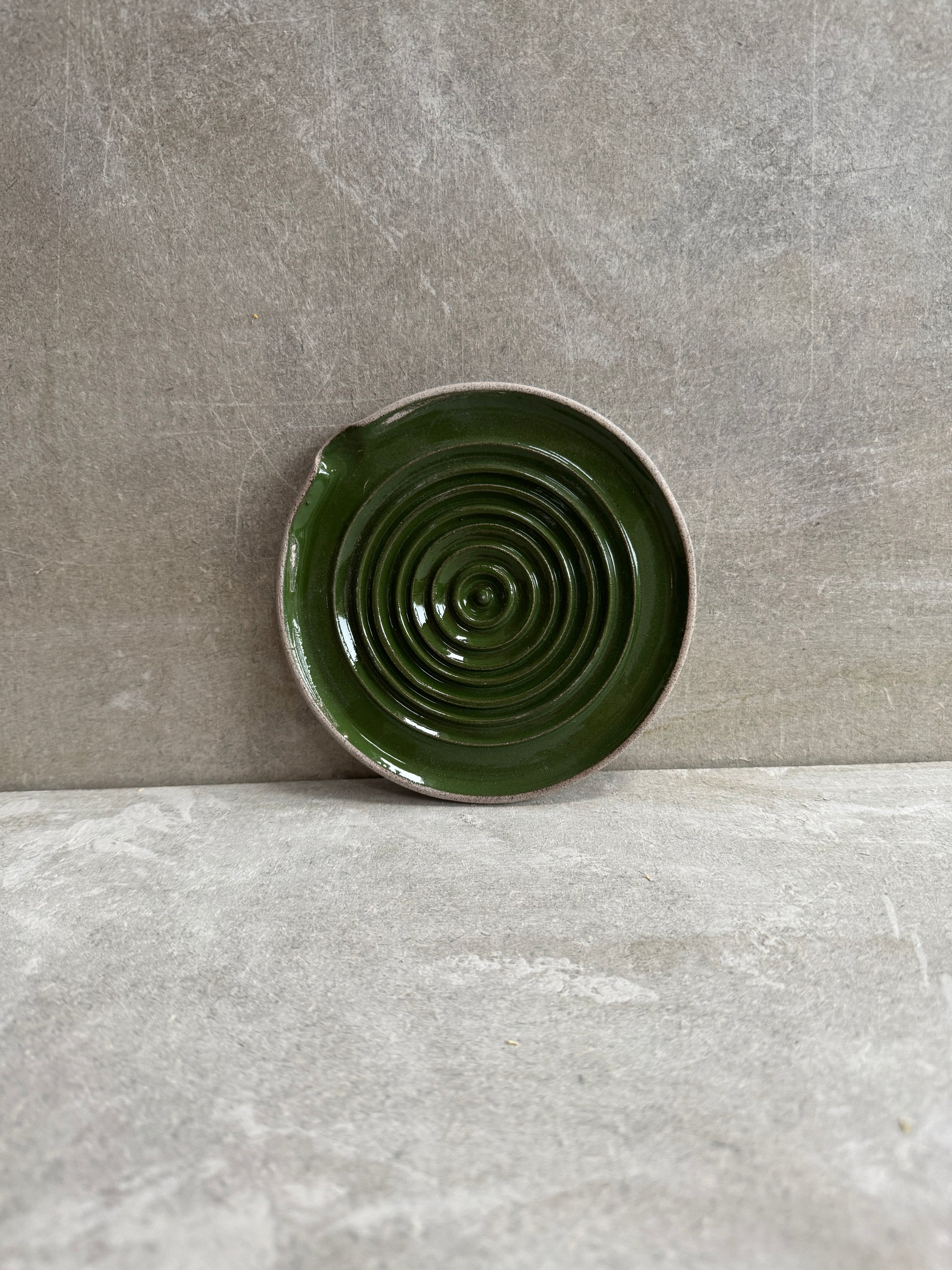 Garlic and ginger grater in grey stoneware with a dark green shiny glaze. Slight uneven glaze round the edge.
