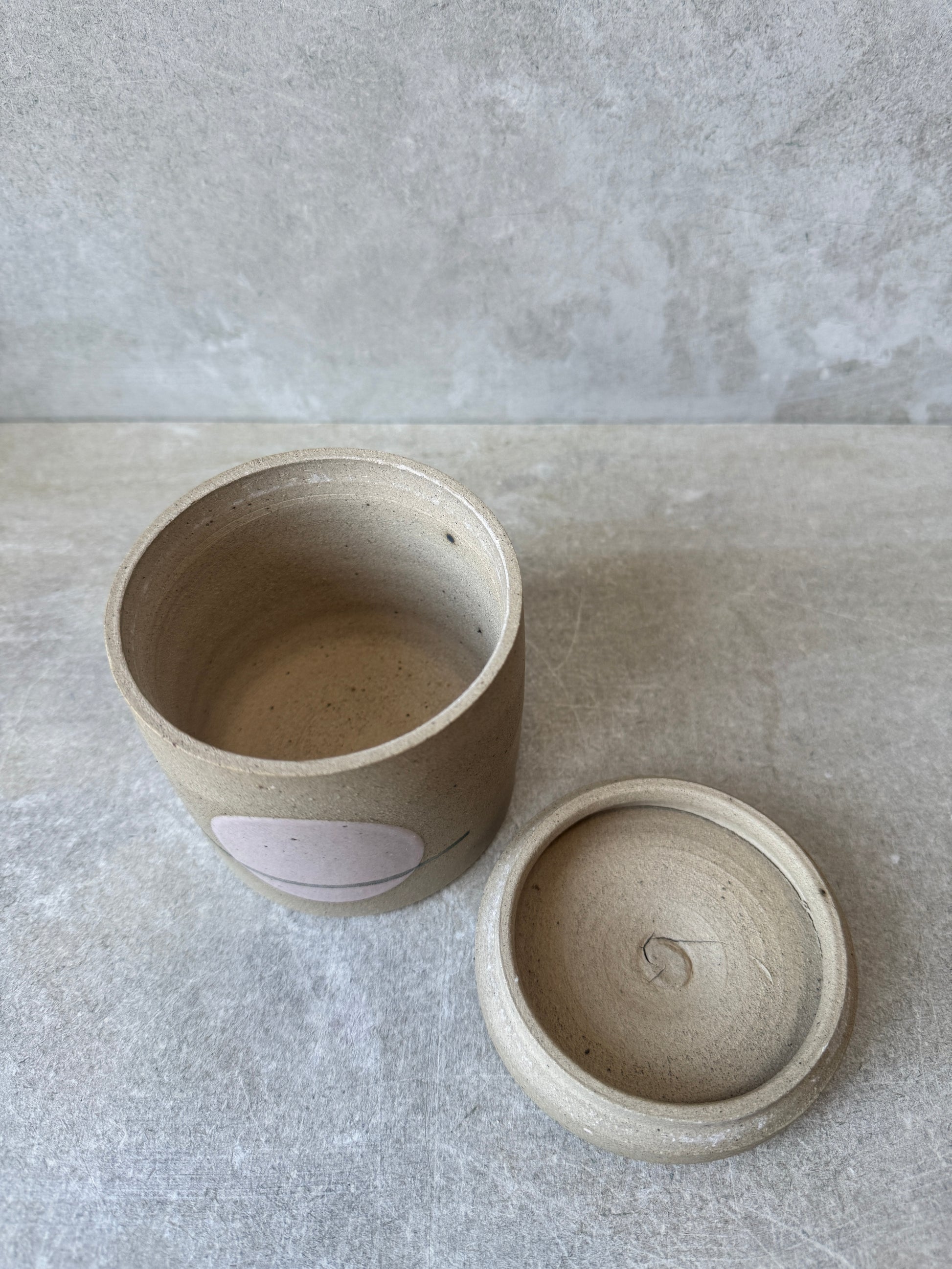 Lidded pot in a speckled buff. Raw clay with geometric designs.