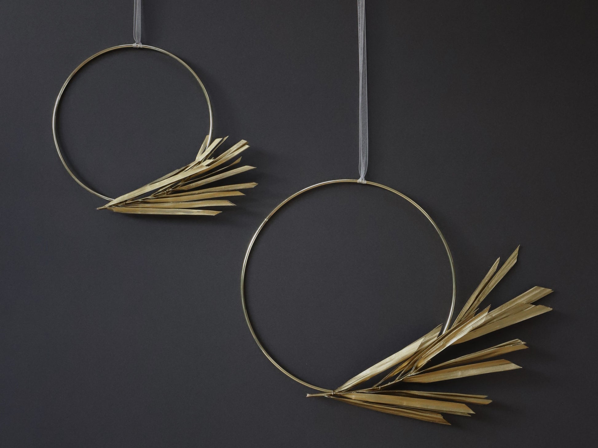 A minimalist festive wreath. Comprising of a gold coloured hoop with gold canna leaves and ivory ribbon. Hang on your door or wall or even your tree.