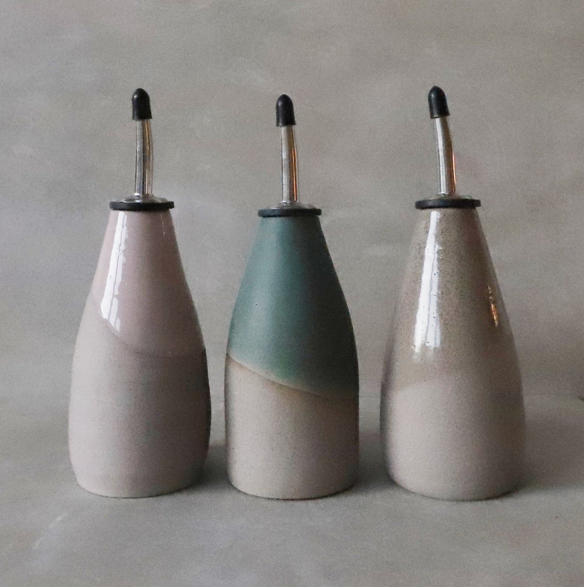 An oil pourer in grey stoneware, glazed with food safe glaze.