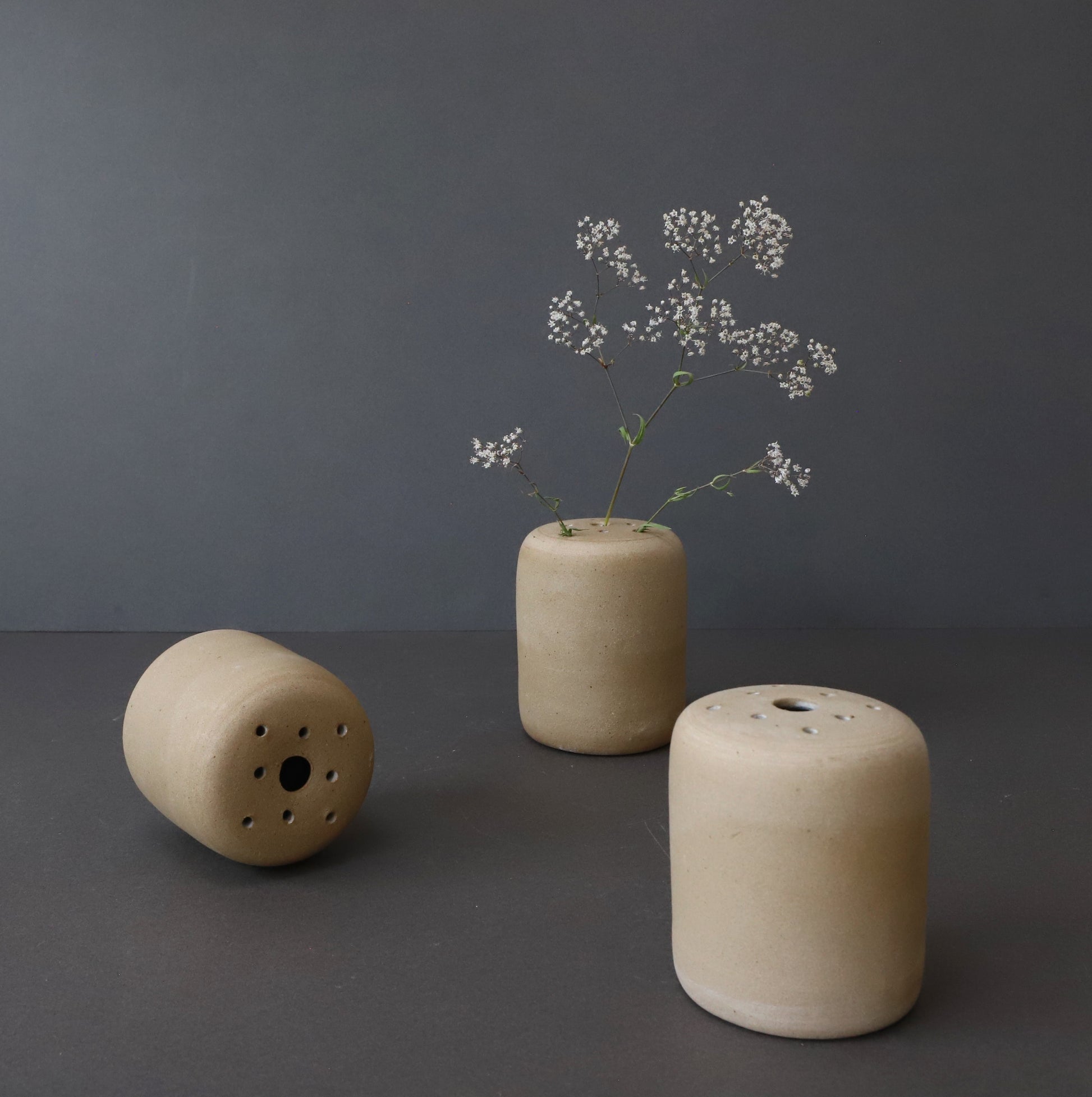 A stoneware vase which is designed to display flowers or foliage however you choose.  The vase is enclosed with different sized holes in the top to hold the flowers in position. It can be filled with water to preserve fresh flowers or used empty for dried flowers.