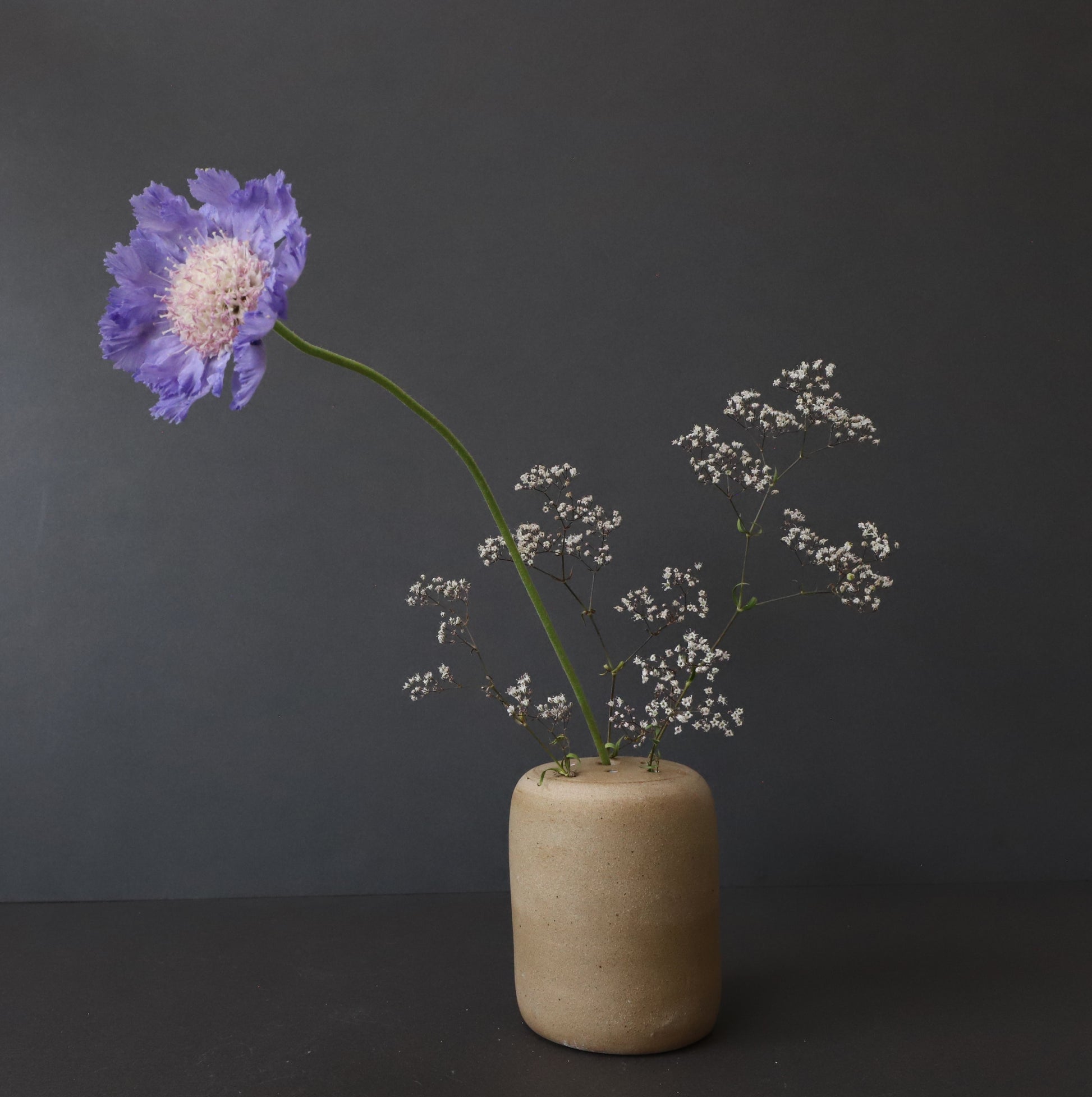 It has been thrown on the wheel then bisque fired to 1000 degrees Celsius. After a satin clear glaze has been added to the inside of the vase, it is fired again to 1200 degrees Celsius.  The outside has been left raw to preserve the tactile feel of the clay.